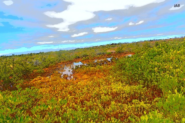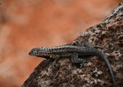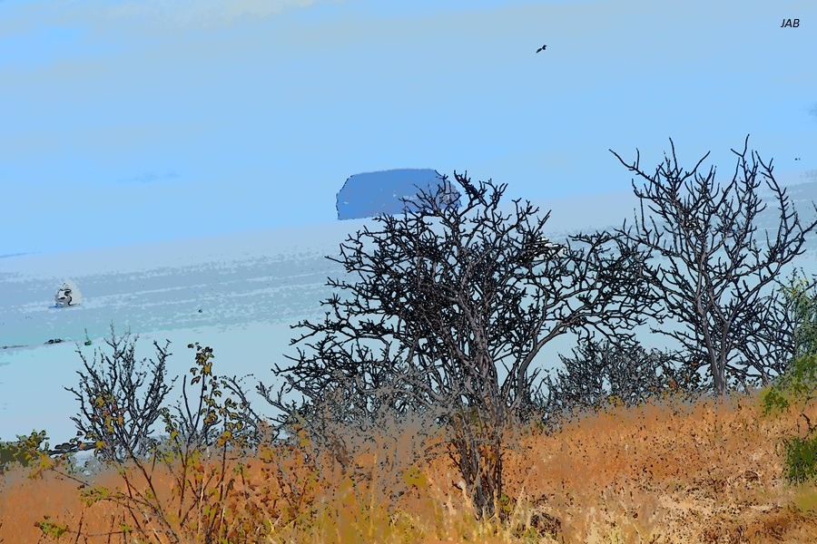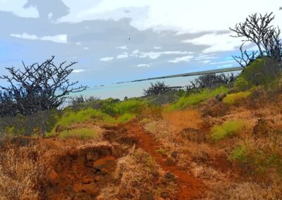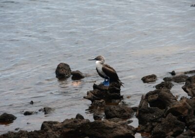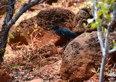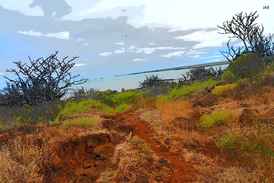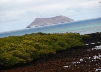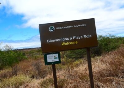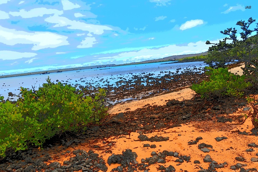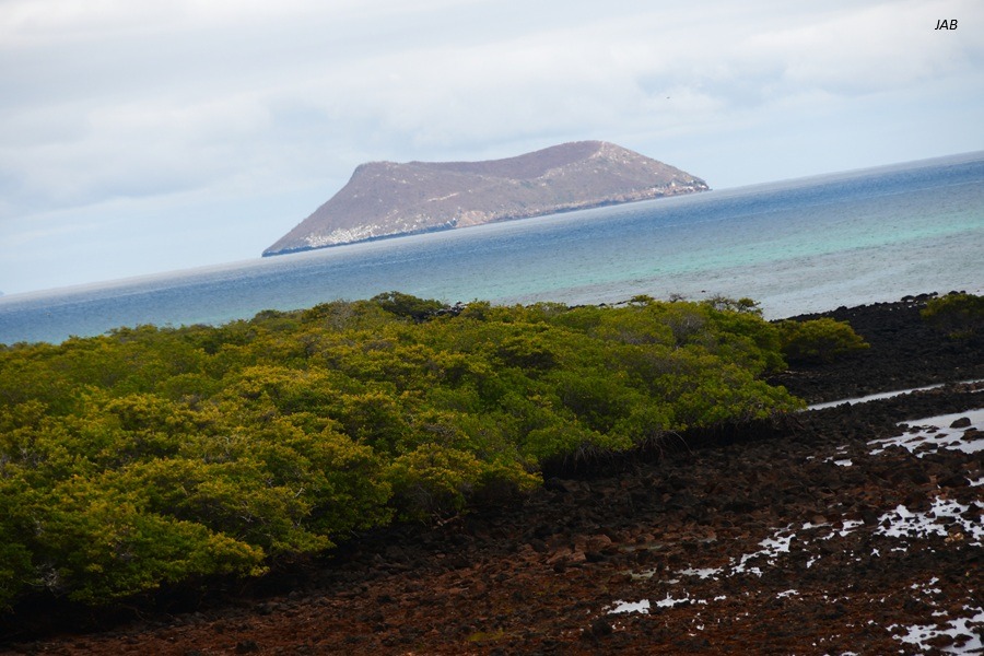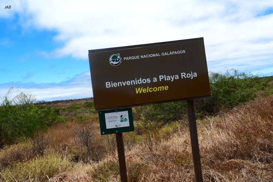 El letrero a poca distancia de la terminal de Canal Itabaca del lado de isla Santa Cruz, señala la trocha apenas visible entre tierra rojiza y las piedras tostadas del piso volcánico. Al cabo el corto trayecto de leve inclinación concluye en la caleta rocosa que esconde a  Playa Roja, en una mañana cálida de cielo abierto al senderismo de bosque seco que contrasta con la mañana plomiza de garúa que cunde en las tierras altas de isla Santa Cruz; allá arriba se genera el verdor y las flores que nutren a las tortugas gigantes mientras acá abajo luce el paisaje de orilla de aguas turquesas teniendo en primer plano la silueta de Daphne Mayor y Daphne Menor, el canal de Itabaca y la planitud de Baltra. Pelicanos de cuello café y piqueros de patas azules pescando en bajamar. Una charca rodeada de mangles acoge a huidizas monjitas que alzan el vuelo, en las piedras medran lagartijas de lava, una flor solitaria brota del suelo árido. Antes del retorno al muelle de pasajeros de Itabaca, el lente de la cámara fotográfica, congela el instante en que una garza de lava captura y devora un grillo endémico de Galápagos.